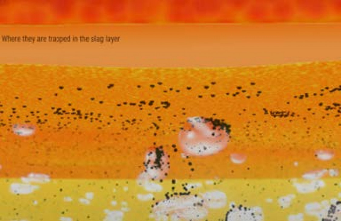 These float up slowly in a helical trajectory that extends their passage through the metal rotating around the vertical axis of the ladle. Slag particles inclusions and oxide films adhere to surface of the argon micro bubbles and float up into the slag layer at the top. The small size of the argon bubbles gives them a long residence time in the melt and together with the extended floating trajectory means that very effective metal purification is achieved (Fig 3b).
