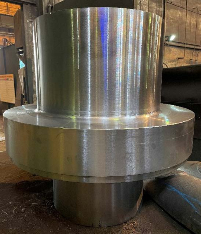 Primary shrinkage has never been present, but ultrasonic echo was always lost within inspection of the bottom hub and upper part under the riser. Repeated heat treatment has been applied to try to refine the grain size and allow ultrasonic inspection but unsuccessfully. Defective parts from the drag (Fig. 13a) and under the riser (Fig. 13b) were machined out by carousel to a depth of 135mm until porosity detected by penetration was removed. Excavated diamater was 300mm in the drag and 400mm under the riser. Porosity detected by penetration test was finally much bigger than identified by ultrasonic test. Additional annealing heat treatment had to be applied after the welding.