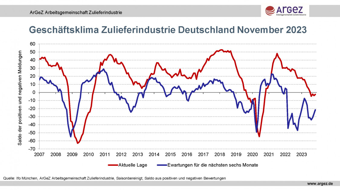 Das Geschäftsklima der deutschen Zulieferer verbessert sich im November um 3,4 Saldenpunkten. Mit einem Wert von -12,2 Punkten bleibt die Stimmung unter den Unternehmen jedoch nach wie vor schlecht. Zwar legen die saisonbereinigten Erwartungen für die kommenden sechs Monate ebenso wie die Beurteilung der aktuellen Geschäftslage zu, dass dies jedoch ein entscheidender Impuls ist, um den Abschwung der vergangenen Monate zu durchbrechen, ist zweifelhaft.