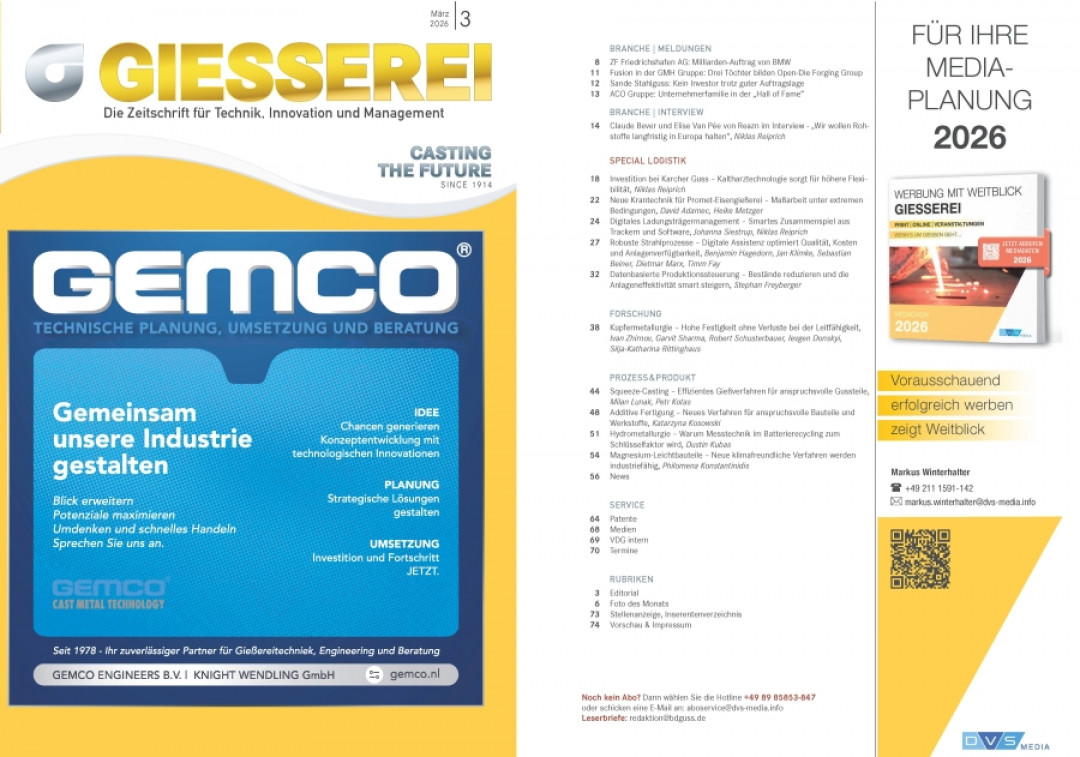 Das März-Heft berichtet unter anderem über Investitionen bei Karcher Guss und die Additive Fertigung bei Kupferlegierungen. Ein ganzes Special widmet sich der Logistik.