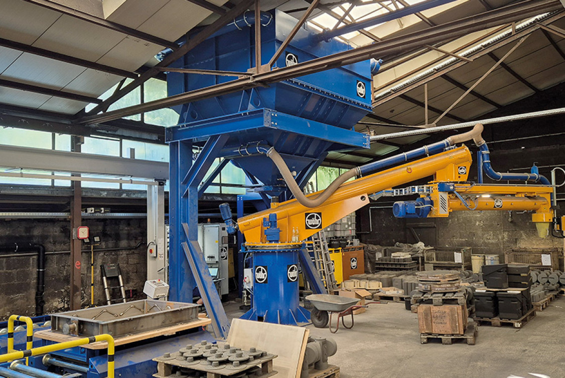 Heute laufen stündlich 5 bis 7 Formen über die neue Anlage, orientiert am realen Bedarf der Gießerei und dem Anspruch an stabile, reproduzierbare Prozesse. Herzstück ist ein Wöhr-Durchlaufwirbelmischer in 2-Gelenk-Ausführung, der mit einer Mischleistung von bis zu 30 t/h ausreichend dimensioniert ist, um auch bei wechselnden Anforderungen stabil zu arbeiten. Sandbunker für zwei unterschiedliche Sandsorten ermöglichen zudem eine schnelle Anpassung an verschiedene Formstoffkonzepte, ohne aufwendige Umbauten. Ein weiteres Merkmal sind die zwei Vibrationstische zum Verdichten der Formen, die ein alternierendes und unterbrechungsfreies Befüllen der Formen erlauben. Wartezeiten am Füllplatz werden dadurch vermieden, was insbesondere bei hohen Taktraten von großer Bedeutung ist. Die gesamte Mischerstation ist zudem mit einer Absaugung ausgestattet, wodurch sich auch die Arbeitsbedingungen deutlich verbessert haben. „Die Produktion ist deutlich sauberer geworden, und das wird von den Mitarbeitern sehr positiv aufgenommen“, stellt Gießereileiter Kirmse fest.
