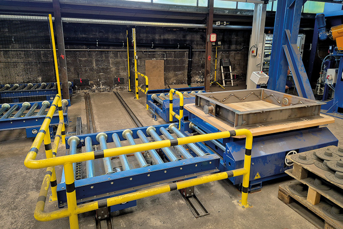 Die anschließende Beschichtung erfolgt über eine halbautomatische Flutanlage. Für die Anlage neu designte, standardisierte Formkästen werden automatisch positioniert, geklammert und gekippt, sodass sie für den manuellen Flutvorgang über der Wanne bereitstehen. Anschließend übernimmt die Anlage den automatischen Weitertransport zur Endmontage. Die nächsten Schritte erfolgen dann in einem benachbarten Hallenfeld. Dort werden die fertig montierten Formen per Hallenkran auf dem Gießplatz verteilt und die freiwerdenden Transportplatten automatisch an den Anfang des Prozesses zurückgeführt. Nach dem Abguss werden die Formen wieder an die Anlage übergeben, die dann den Transport zum Ausschlagrost übernimmt. Mithilfe von Transferwagen, Drehtischen und Rollgängen werden die Formen automatisch und direkt auf Walzen in die Nachbarhalle gefördert. Ein Handling sonst üblicher Transportpaletten kann dadurch entfallen. „Der größte Vorteil ist ein deutlich reibungsloserer Produktionsablauf“, fasst Karcher zusammen. „Die Störungen der alten Anlage sind beseitigt, und wenn heute Probleme auftreten, können wir sie gezielt beheben“.