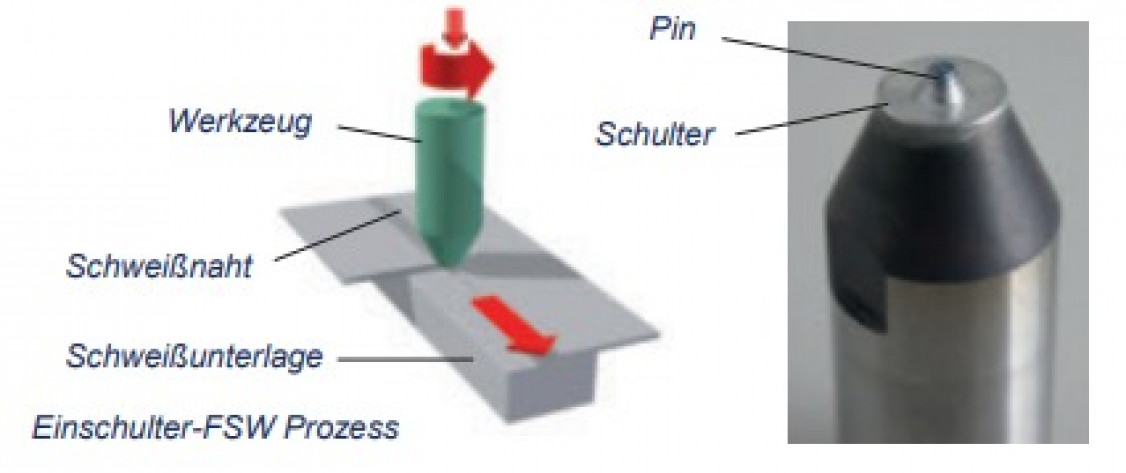 Das FSW erfordert in der Regel ein rotierendes Schweißwerkzeug, ein Spannsystem zum sicheren Einspannen der Fügepartner und eine Schweißunterlage (engl. Backing), (Bild 3, links). Das rotierende Schweißwerkzeug (Bild 3, rechts) besteht aus einem Pin und einer Schulter. Zu Prozessbeginn wird das rotierende Werkzeug in das Werkstück gefahren, bis die Schulter die Werkstückoberfläche berührt und minimal eintaucht. Im Übergang von der Schulter zum Werkstück sowie im Pinbereich wird die erforderliche Prozesswärme durch Reibung und Deformation des zu schweißenden Werkstoffs erzeugt. Das Material wird hierbei nicht geschmolzen, sondern plastifiziert und in einen teigigen Zustand überführt. Durch das permanente Verrühren des Werkstoffs kann somit eine hochbelastbare Schweißnaht mit einer Festigkeit nahe der des Grundwerkstoffs erzeugt werden. Die dabei entstehenden Prozesskräfte werden über das Werkstück in das Backing abgeleitet.